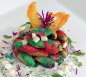 Procedimento: Mettere a cuocere le patate con la buccia, nel frattempo rendere in una purea, con il CUTTER C15 Sirman, prima gli spinaci lessati e strizzati, poi la polpa di zucca gialla cotta. Disporre su di un foglio di carta da forno le due purea e quella di concentrato di pomodoro (separate) e metterle in FORNO Microonde PANASONIC per alcuni minuti, affinché si asciughino e perdano il più possibile la loro umidità. Questa operazione serve per far unire meglio i vari impasti e renderli della medesima consistenza. Una volta cotte le patate, sbucciarle e passarle al setaccio mettendole su una spianatoia, unire i tuorli d’uovo, il sale, la fecola e la farina. Fare un primo impasto velocemente, quindi dividerlo in 5 parti. Una parte bianca o neutra, e le altre con i vari ingredienti (nero di seppia, zucca gialla, spinaci e pomodoro). Formare con gli impasti colorati dei sottili e lunghi rotolini ed unirli fra loro “avvolgendoli” su se stessi, Tagliare dei piccoli gnocchetti e con l’apposita mandolina di legno (per mallureddus), passarli rigandoli per ben due volte, una volta dritta e una volta all’ incontrario, ricavandone delle “chicche”. Infarinarle leggermente e cuocerle in abbondante acqua salata. Fare profumare nel burro le erbette tritate a fuoco moderato, unire la panna ed il verde di Montegalda mescolando continuamente fino ad ottenere una crema liscia e consistente. Disporre su piatti caldi la salsa e le chicche sopra caldissime. Guarnire a piacere.