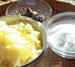 Ingredienti: 1 chilo di patate bianche o di patate americane; 400 grammi di zucchero; 200 grammi di cioccolata di Modica; 1 bicchierino di rhum (facoltativo); scorza di un limone.
