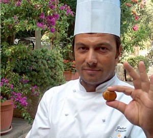 Nell’incantevole borgo del poeta Petrarca, ad Arquà, lo chef Andrea Cesarone propone abitualmente prodotti di stagione, i suoi menù sono delle proposte alimentari studiate con deliziosa sapienza e preparate con la maestria di chi conosce la tradizione e chi vuole affascinare il commensale con un po’ di innovazione. Dovevo parlare di castagne e nocciole ed ecco che ho voluto scoprire come Andrea impiegava i due frutti dell’autunno, rendendomi conto che anche lui gioca in cucina sperimentando un po’. Nella cucina di Andrea i due frutti, castagna e nocciola, sono usati con frequenza dall’antipasto al dolce, diventano ingredienti caratterizzanti di una pietanza e sono impiegati con studio attento e non con semplice disinvoltura. Non tutti sanno che la castagna può essere consumata fresca, senza esagerare però, e la sua struttura croccante può essere apprezzata bene con alcuni pesci in crudità. Certo che deve essere privata della sua pellicina e poi tagliata a fette sottili (vedi foto). Un’ idea di Andrea per un antipasto appetitoso è la millefoglie di pesce e fette sottilissime di castagne fresche, il tutto condito con ottimo olio d’oliva extravergine; del buon pane tostato non può mancare, se poi è confezionato con farina di castagne meglio ancora. Anche la nocciola Andrea l’ha impiegata con alimento crudo: si tratta di una millefoglie di filetto in crudità con nocciole sbriciolate (vedi foto). Anche qui un pane profumato con farina di nocciole è il massimo. Insomma due proposte alimentari dove sia castagne che nocciola sono i veri marcatori di gusto, in un’epoca in cui purtroppo entrambi, castagne e nocciola, sono relegati dagli chef a ruoli gastronomici marginali. In realtà, la versatilità dei due frutti deve essere intesa come la possibilità di uno chef di saperli impiegare nei diversi modi, dall’antipasto al dolce, ricordando che caratterizzano fortemente un alimento: in purea, in crema, in briciole, in pasta, sia nocciole che castagne sono eclettiche, servono per riempire un piatto per gusto e per pastosità. La castagna in crema rende di più, ecco che diventa versatile per ripieni, per salse, per farina. La nocciola, invece, per la sua struttura grassa, deve essere manipolata con cura, in pasta è fortemente caratterizzante, in granella invece esprime la sua naturale croccantezza e consigliamo sempre di impiegarla senza pellicina.