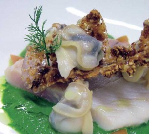 Per l’assemblaggio del piatto: crema di cime di rape g 350; filetti di pesce persico poches n° 6; torrone neutro alle nocciole pezzi n° 6; vongole veraci sgusciate g 80; olio extra vergine d’oliva a crudo q.b.; concassè di pomodoro a rombetti g 30; ciuffetti di finocchietto n° 6. Abbinamento: birra bionda Kölsch.