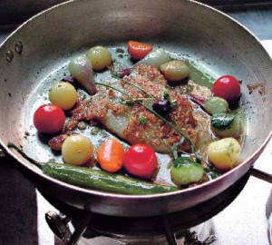 Per completare il piatto: 1 patata non molto grande; 1 zucchina; 1 carota; pomodorini ciliegia. Sbucciare la patata e tagliarla a spicchi e a strisce non troppo sottili le altre verdure (o a forma di pallina), sbollentare le verdure in acqua salata. Procedimento: lavare e asciugare i tranci di rombo. Mischiare la granella di nocciole con i pangrattato, impanare bene il pesce con la granella e il pangrattato premendo leggermente per farlo aderire bene dai 2 lati. Sciogliere il burro sulla padella da flambé, rosolare 5 minuti per lato il rombo, aggiungere le verdure lessate e i pomodorini ciliegia, aggiustare di sale e pepe. Innaffiare con il prosecco e spadellare per pochi minuti. Bagnare con il brandy e flambare il piatto.