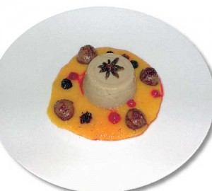 Preparazione: cuocere le castagne nel latte con 1 bacca di vaniglia. Togliere la vaniglia e passare al setaccio le castagne – lasciare raffreddare. Montare i due tuorli d’uovo con lo zucchero. Montare la panna ed amalgamarla lentamente all’uovo, aggiungere la purea di castagne e la gelatina. Sistemare su stampi individuali e porre in frigo per 2 ore ca.