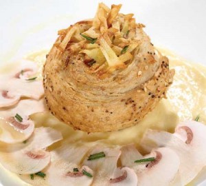 Preparare il cestino utilizzando il cornetto natura. Si stendono i cornetti sulla teglia e si privano delle punte con un taglia pasta (le punte verranno utilizzate a parte per creare dei piccoli coni salati). Mettere all’interno di ogni cestino un pezzetto di formaggio tipo Asiago. A parte preparare una patata cruda: sbucciare e grattugiare grossolanamente la patata, poggiarla sopra ad ogni cestino pressandola un poco in modo che aderisca alla pasta di ogni cestino, spolverare con parmigiano, rosmarino e un pizzico di sale. Infornare il tutto a 180° per 20 minuti. Nel frattempo: preparare un purè di patate delicato. Insaporire con parmigiano, sale e un po’ di noce moscata. Tagliare i funghi sottili, quindi condirli a parte con l’olio e il limone sale q.b. Stendere sul fondo del piatto 3 cucchiai di purè ancora caldo. Poggiare il cestino in centro e decorare con i funghi a raggiera.
