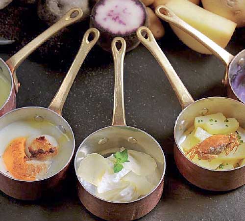 Soffice spuma di patate leggermente affumicate con scampi in crudità Ingredienti per 6 persone: g 150 patate bollite e pelate; [...]