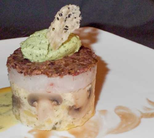 Sformatino tiepido di patate e funghi con cruditè di gamberoni e cremoso al pesto delicato di sedano